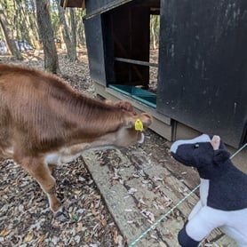 我が家に来てもうすぐ3年になるホルスタインのぬいぐるみ、「うしどの」。