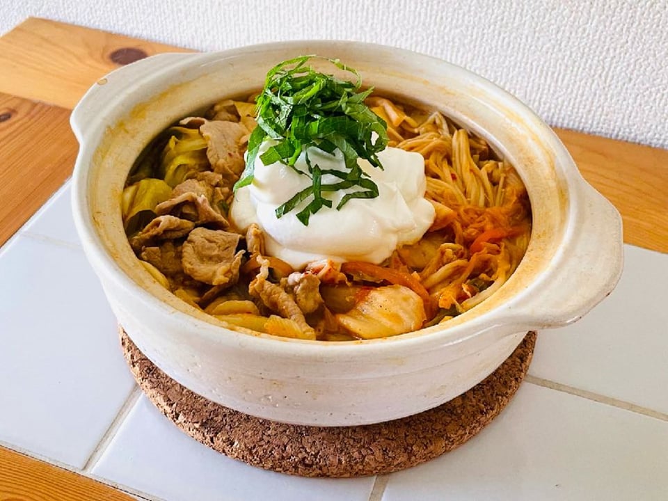 野菜が柔らかくなったらキムチと豚肉を加え、豚肉の色が変わったら火を止めて水切りヨーグルトと大葉をトッピング。